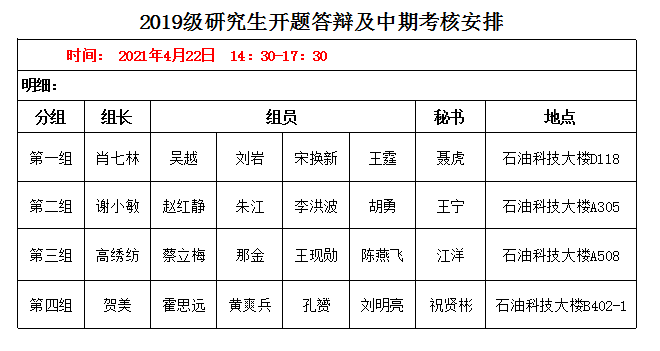 通知:我院将于2021年4月22日下午2:30进行我院2019级研究生开题答辩及中期考核,具体安排如下: