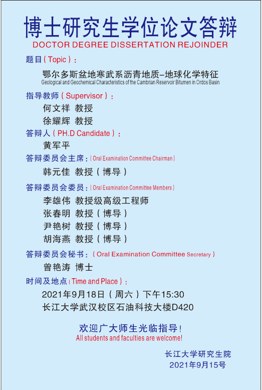 2021年9月博士研究生毕业答辩公告