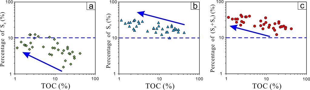 在该方法中,采用了更精细的升温程序划分:前3分钟保持通氮气,但程序不升温,罐体保持低温状态,此时检测器检测的烃类化合物为游离气态烃(Sg);随后温度快速升温到90℃,并保持5分钟,这个过程中检测器检测到的是轻烃组分(S01);最后温度快速升温到300℃,并保持15分钟,这个过程中检测器检测到的是游离油组分(S1)。游离气态烃(Sg)、轻烃组分(S01)、游离油组分(S1)三者相加之和才是泥页岩真正的含油率。这个数据相较于常规的热解参数S1而言,前两者在以往的页岩油含油性评价过程中被明显的忽略了,且这两个组分的散失对最终含油性结果的影响与样品的TOC值息息相关。TOC越低,轻组分的散失对页岩含油性评价结果影响越大(图2)。