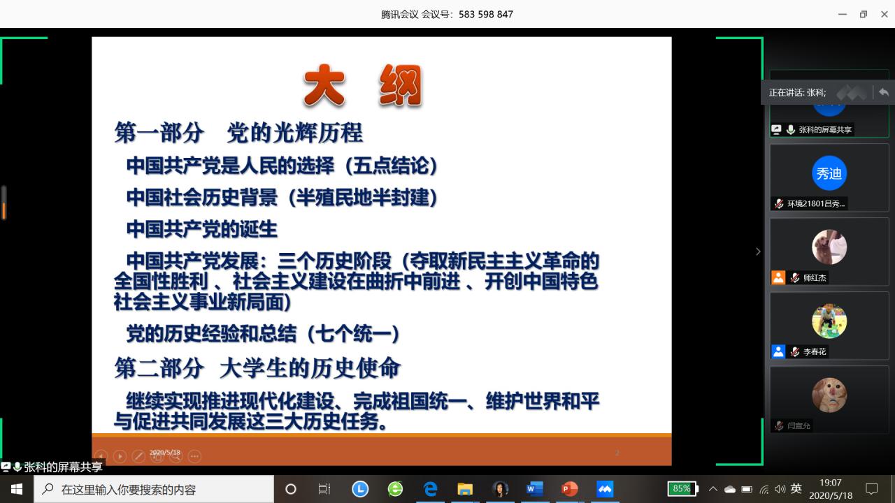 (图/文:吕秀迪)为进一步做好开云官方网页版官网党员发展工作,加强对发展对象和入党积极分子的教育和培养,引导其提高思想觉悟,保证发展新党员的质量。资环学院于2020年5月18日晚19:00以线上腾讯会议的形式举行了2020年上半年入党积极分子和党员发展对象培训会议。资环学院党委书记张科主讲,党委副书记范梅英参加、本科学生工作党支部书记李春花主持,共130余名入党积极分子和党员发展对象线上学习。