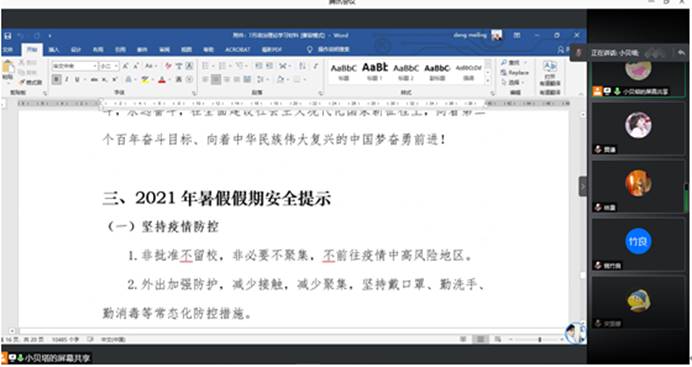 除学习党的相关会议精神外,随着暑假的到来,各班再次强调了暑假安全及留校相关手续的办理工作,由各班班长带领大家具体解读暑假留校研究生申请文件以及留校注意事项,严格按照学生本人申请、家长和导师同意、培养单位审批的程序,严禁在寝室、办公室、实验室使用违规电器,每天健康打卡,同时还进行防溺水、运动安全、交通出行、饮食安全、防火防盗、安全防疫等方面安全知识学习,安全无小事,警钟需长鸣,提高大家安全意识。