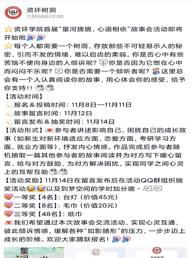 (通讯员 张昊冉 图/文)为增加同学之间的互动交流,改善和调节学习和生活中的不良情绪,资环学院团委学生会心育部在线上举行了资环学院首届“星河旖旎,心语相依”故事会活动。活动时间为2021年11月8日至2021年11月14日,活动对象为资环学院全体学生。