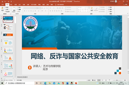 接着,由艺传学院辅导员肖淳老师向大家介绍网络、反诈与国家公共安全教育问题。肖淳老师分别从预防校园网贷、预防电信(网络)诈骗、预防网络违法犯罪、其他国家公共安全四个方面讲解。为有效预防诈骗,肖淳老师给出几条建议,她希望全体同学能够提高自身思想道德教育,提高自身法律意识,学会处理现实与愿望的矛盾,做事前理智思考。