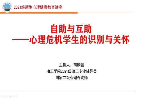 然后,由油工学院辅导员商麟鑫老师向大家介绍大学生心理健康教育问题。商麟鑫老师从三个方面讲解心理危机学生的识别与关怀:心理健康的表现、心理危机的识别与关怀、心理咨询的误解。商麟鑫老师认为我们应该关注奇怪的言谈、思维和行为,过度的情绪体验和表现,自身社会功能不完整,影响他人的正常生活等行为,及时调整自己的心态并帮助他人,在有需要的情况下可以寻求心理健康中心的帮助。