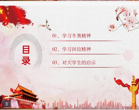会议开始,各班班委都先向同学们简单介绍了冬奥精神与回信精神的丰富内涵,并说明了学习这两种精神的重要性,并向同学们展示了此次班会内容目录:主要分为“学习冬奥精神、学习回信精神、对大学生的启示”三个方面。同时,在学习过程中,同学们也从总书记的话语中感受到了青年一代的任重而道远。我们作为新时代的青年人,要谨记总书记的嘱托,志存高远,脚踏实地,把青春和热血投入到为祖国人民的服务中去。