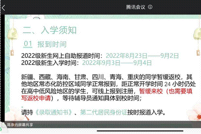 (通讯员 图/文 余凌)从高中到大学,从熟悉的家乡来到陌生的城市,面对新的环境,新的大学生活,2022级的新生必定会感到有所不适。为帮助新生更快的适应大学,提高同学们的安全意识,解决他们的在新环境中所面临的种种问题,让他们尽快适应大学生活并对大学生活有一个积极进取的生活态度。8月26日学院于腾讯会议开展了“梦想起航,安全至上”新生主题班会。各班班导及2022级全体学生参加新生主题班会,主题班会由班导主持。