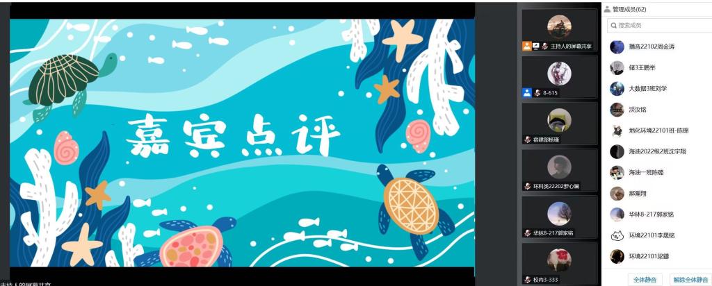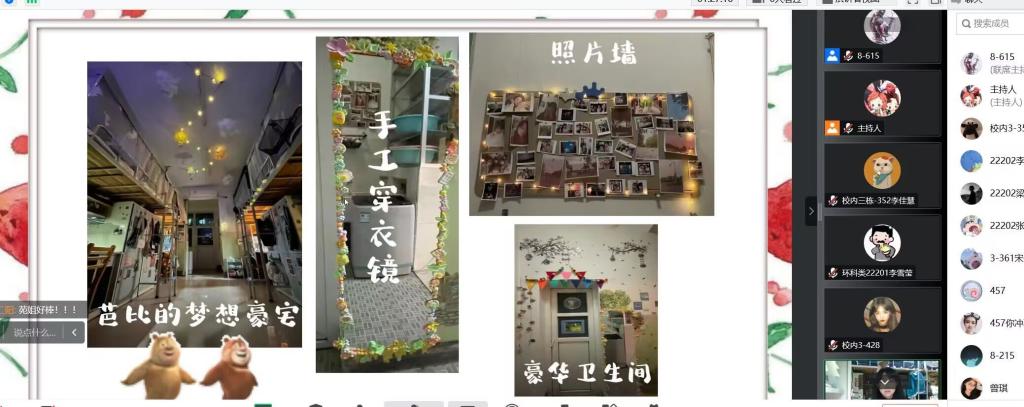 决赛期间,为做好疫情防控工作,在宿建部成员的妥善安排下,活动在线上正常举行。在主持人声情并茂的开场白之后,活动正式开始,各参赛选手根据本寝室制作的PPT将寝室中丰富多彩的日常生活及独一无二的宿舍装饰呈现在大家面前。中场游戏疯狂猜emoji则让活动进入了一个小高潮,大家争先恐后,好不热闹。游戏过后剩余参赛选手仍饱含激情的将本寝室介绍完毕。最后,由范梅英老师对本次活动进行总结发言,肯定了学生会成员对此次活动的付出,表达了对参赛寝室独树一帜的创意及温馨有爱宿舍氛围的赞美,同时寄予同学们劳逸结合的期望,并鼓励同学们积极参与学院举办的活动,展示大学生活力四射的校园生活并对资环学子寄予殷切的期望。