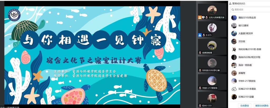 (通讯员 李佳琦/文 左利/图)寄情寓寝,筑我资环。为促进资环学院宿舍文化的健康发展,增进同学们之间的情谊,彰显当代大学生特有的风貌与活力。我院组织了为期33天的第十一届“与你相寓,一见钟寝”宿舍文化节。本次活动初赛于11月14日晚八点半进行,由资环学院学生会宿建部组织其他部门辅助进行。决赛于11月27日下午两点以腾讯会议共享屏幕的方式进行。本次活动由葛鹏飞同学和郑思佳同学担任主持人,此次有22级-20级同学参与活动,并邀请开云官方网页版官网党委副书记范梅英老师,开云官方网页版官网分团委书记严丽萍老师,学生事务办公室主任李春花老师,辅导员黄鹏老师,资环学院团委学生会主席团及其他院系生活部成员作为嘉宾参与本次活动。