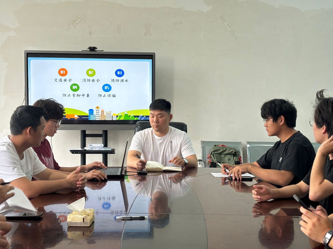 会上,首先由宿建部成员刘锦华以PPT的形式消防安全、交通安全以及防溺水、防诈骗等多个方面展开,讲述了端午假期期间应注意的安全问题阐述了忽视安全的危害及其处理办法随后郭政老师重申关于交通安全的相关事项强调交通安全不仅体现在在校园之外,更存在于校园之内,要求各班安全员提醒学生注意上下课通勤期间的交通安全,还要求各安全员按时走访本班宿舍,自查违规电器,保证学生日常生活安全,最后明确了安全员考核机制,从按时到会、材料合格等方面提醒各班安全员按时完成相应任务,还提醒各安全员要督促学生真实有效填写假期去向表