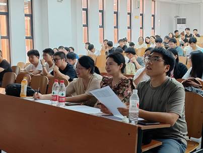曾艳涛老师与黄鹏老师先后发言,提醒新生要密切关注班级群内关于学籍工作的通知,以便顺利开展后续工作。曾老师围绕学生培养,强调要与导师之间沟通,师生共同制定详尽的培养计划。同时,通过黄鹏老师对学院管理工作、导师团队、奖惩机制及防范诈骗等各方面的介绍,同学们对学院有了进一步了解。