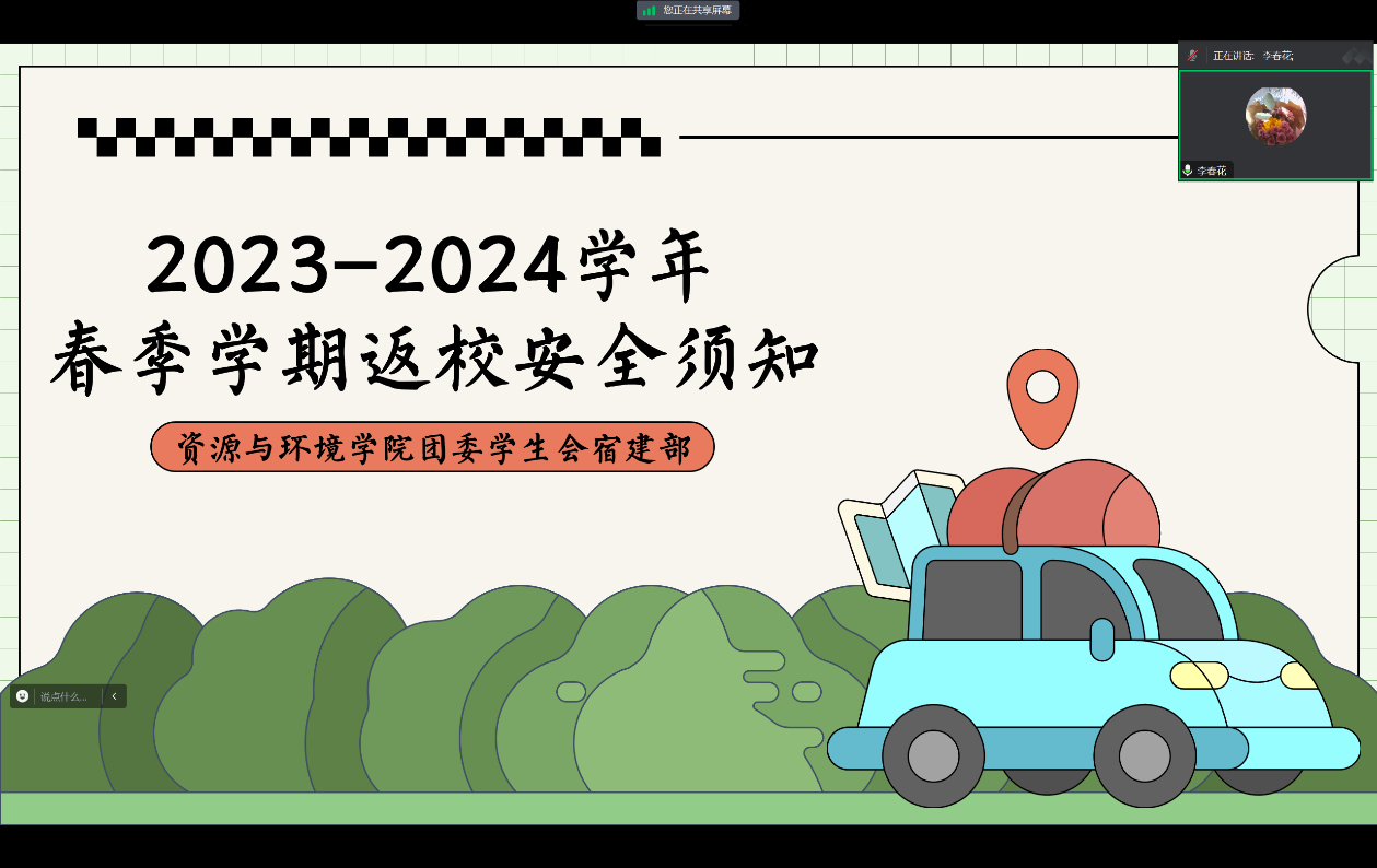 会上,宿建部成员刘锦华通过PPT的讲解,从报到时间,返校须知及路途安全三方面展开,向各安全委员讲述了返校时同学们应要注意返校前携带全个人物品,返校途中注意保护个人财产安全,并时刻注意气候变化,返校后及时整理寝室等各项事项。李春花老师强调提前返校和延迟返校学生需及时报备,近期天气恶劣,要求同学们在返校途中注意自身安全,提高防诈意识,同时提醒同学们开学后积极备战补考、诚信应考。