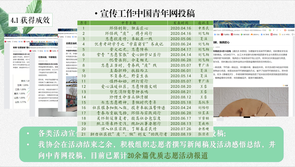 常青生态志愿者协会为了加大宣传力度将活动开展取得的效果发挥到最大,协会内部专门建立中青校园通讯社,不到一年的时间里就已经累计20余篇优质志愿活动报道,这得益于广大的有志青年不断在中青校园上投稿。他们将协会每一次举办的活动以及获得的优异成绩展现在中青校园广大高校平台上,每一篇文章都有一个特有的故事,在中青校园中讲好社会好实践,讲好学校好故事,传播协会好文化!