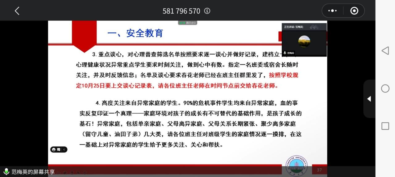 会议最后,由李春花老师补充说明 。她再次强调了学生心理健康教育问题的重要性,并对班主任在线上进行了访谈培训。她强调对于存在心理健康问题的学生,班主任们一定要主动去沟通,委婉地去了解学生的情况。比如在询问学生情况时,可以说:“你们家现在有几口人”“最近有没有遇见什么烦心事”等。以温和的语气和委婉的方式对学生进行细心地疏导。