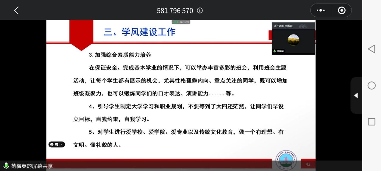 最后,范书记就学院学风建设提出了自己的展望。在英语交流日益广泛的现在,英语成为同学们走进社会不可或缺的本领。范书记心系学子未来,鼓励19级和20级的班主任们更加重视同学们的英语四级学习,让资环学子在激烈的社会竞争中不会掉队。与此同时,范书记也努力将资环学子发展有能力,有温度的人。通过学院的各项活动,锻炼同学们的口才表达,演讲能力,在温馨和谐的氛围中养成同学们爱校园,爱学院的良好习惯 。