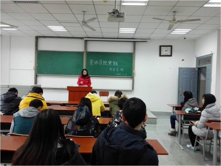 为了确保安全,也为了给寒假留校的学生提供更多的便利,2017年1月11日下午三点,资环学院在A-102召开了寒假安全会议。本次会议由资环学院办公室主任刘娥老师主持,资环学院本科生、研究生以及学生工作辅导员李春花老师共56人参加了此次会议。