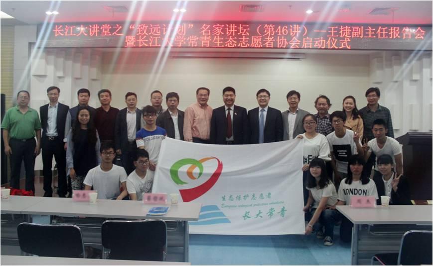 (学生记者 齐玉琴 见习记者 徐紫霞/文 学生记者 曾宪/摄)4月26日下午2时许,“长江大讲堂之‘致远计划’名家讲坛第46讲暨开云官方网页版官网常青生态志愿者协会启动仪式”在武汉校区图书馆二楼报告厅举行。中法武汉生态示范城管委会土地规划处副处长孙爽成、蔡甸区湖泊管理办公室主任喻志勇、蔡甸区环境保护局高级工程师涂仁超,副校长郭海敏、武汉校区常务副校长赵林、武汉校区副校长蔡哲斌、常青生态志愿者协会全体志愿者以及师生代表们参加了讲座。