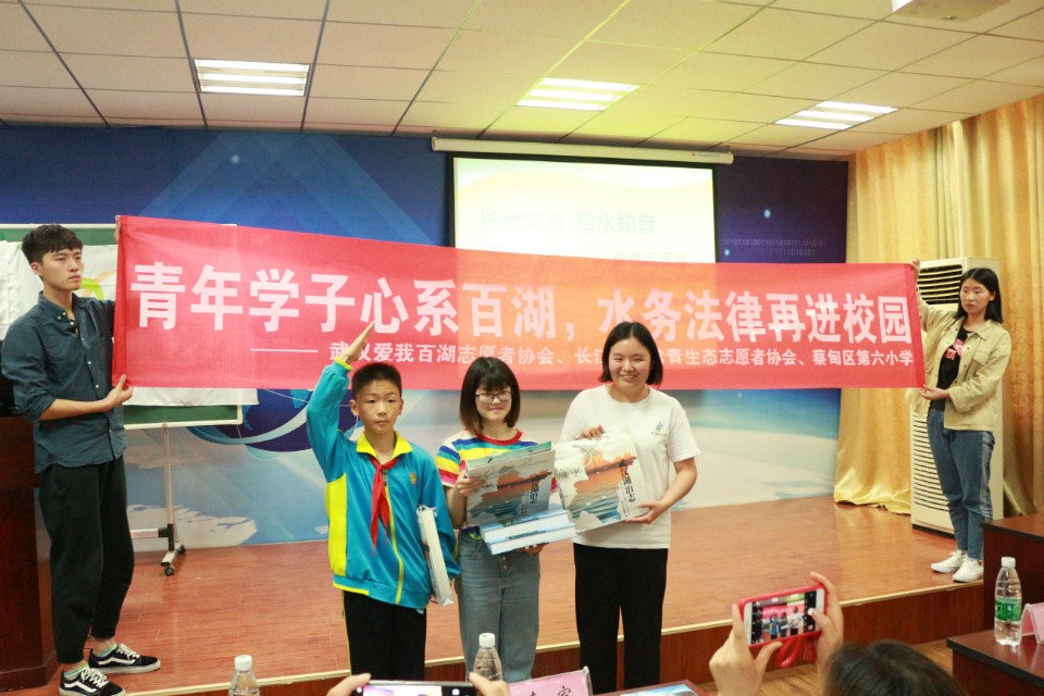活动伊始,武汉爱我百湖志愿者协会副秘书长张淑倩为我院和蔡甸区第六小学赠送了《武汉湖泊志》、《水法规汇编》,随后进行了市属湖泊、水生植物的科普和趣味问答,帮助同学们强化保护湖泊的相关知识。