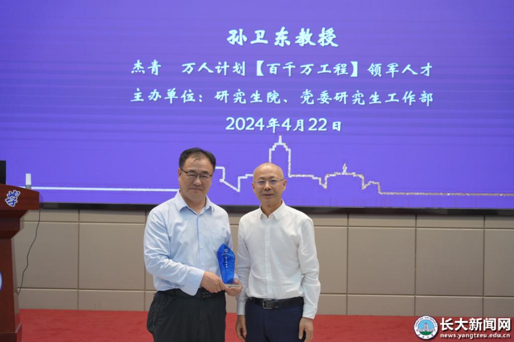报告结束后,学生代表为孙卫东教授敬献鲜花。校长刘勇胜代表学校向其赠予了“求实讲堂”杯。