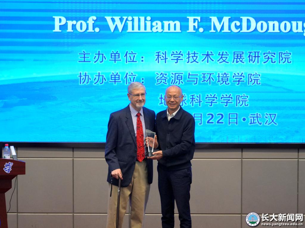 报告结束后,学生代表向William教授赠送了鲜花。校长刘勇胜代表学校向William教授赠予了具有纪念意义的“长江讲坛杯”。