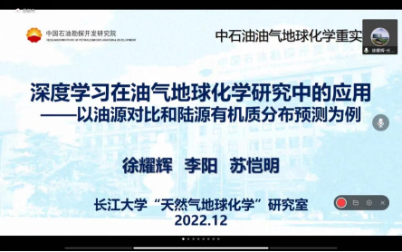 此次会议中,徐耀辉教授代表“天然气地球化学”实验室做了题名为“深度学习在油气地球化学研究中的应用—以油源对比和陆源有机质分布预测为例”的学术报告,提供了人工智能与油气地球化学相结合的研究实例,提出了建立油气地球化学“分析-评价-决策”智能支持平台的设想,得到了与会专家的肯定。