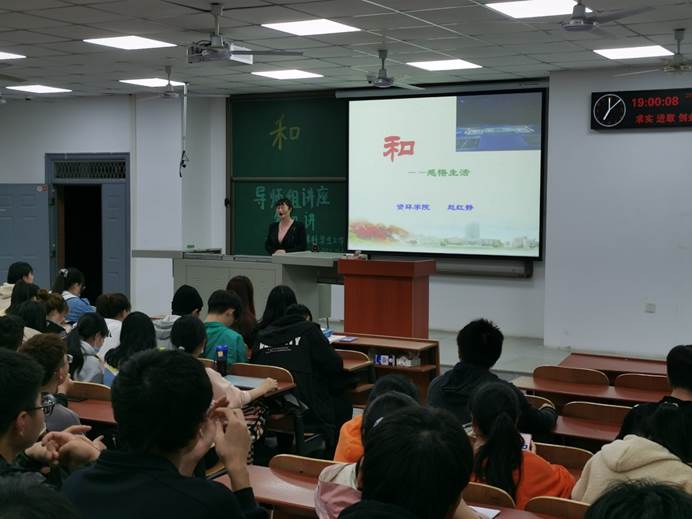活动伊始,赵院长和同学们热情地和同学们打招呼,进行了简短的自我介绍,赵红静老师表示之前和同学们在课堂里见过面了,倍感亲切。此次讲座分为两个部分,分别是:分析浅谈“和”与作为大学生应如何把心态放平和的两个内容。
