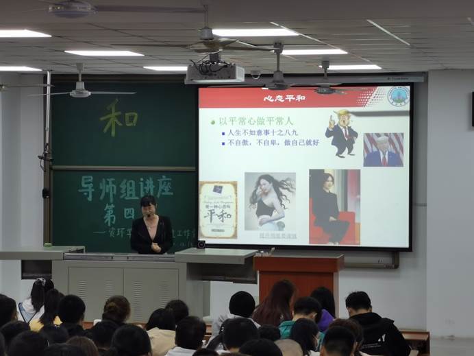 在讲座过程中,赵院长以四级考试来举例子,这次四级没过,就努力争取下次过,然后提出保持身心健康,就需要我们在做任何事情的时候要做最坏的打算。其次还讲到低调做人,高调做事,心态放平和,自我定位清晰,我们是普通人,所以要以平常心做平常事,对自己不满意,大多是没达到自己的目标,应给自己树立合理的预期。赵院长展示了几张图片,并表示当今大部分年轻人还是以颜值当道,但给同学们强调了提升颜值要谨慎,以最早的网红芙蓉为例子,用七、八年的时间慢慢平和,改造自己,气质有了跃迁。之后通过集体互动的形式,进行了一个心理测评,同学们都很积极配合。
