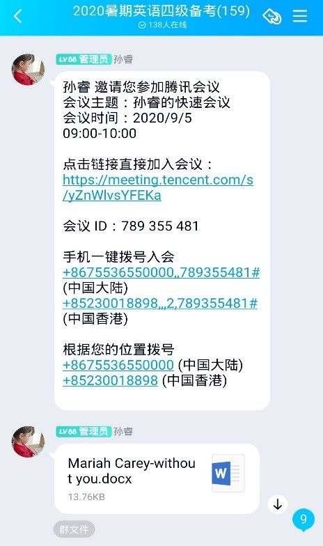 线上英语教师交流会,暑假期间邀请了外语学院优秀教师孙睿老师给同学们线上指导;形成辅导员、班主任、班级导师、英语教师和家长五位一体的的联动模式,以确保同学们的英语学习不流于形式,并希望以英语学习推动同学们自我学习、自我管理的学习生活习惯。