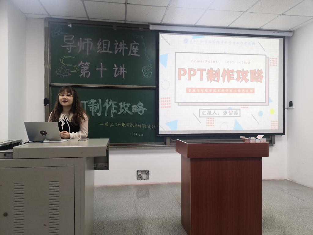 (通讯员 李如意)为了让刚开始接触PPT制作的大一学生能更加的得心应手,少走弯路。20214月8日晚7时整,资环学院本科学生工作党支部开展了导师组讲座第十讲。讲座由导师张紫茜同学为大家宣讲。资环学院全体大一学生参加。