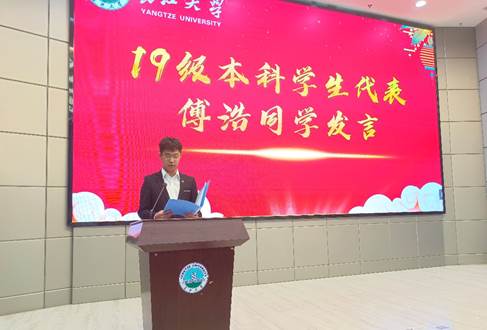 随后,2019级本科学生代表傅浩,2021级本科新生代表苑梦云,2021级研究生新生代表刘于民分别发言。傅浩和刘于民向大家分享了自己大学生活的酸甜苦辣,根据自己的经验向新生提出了一些建议。苑梦云满怀信心地向大家表达了自己对大学的憧憬以及给自己定下的目标。掷地有声的文字,激情澎湃的演讲,点燃了新生的雄心壮志。疾风知劲草,在今后的大学生活中,唯有满怀希望,认真做好手上的每一件事情,才能有所收获,不负韶华。