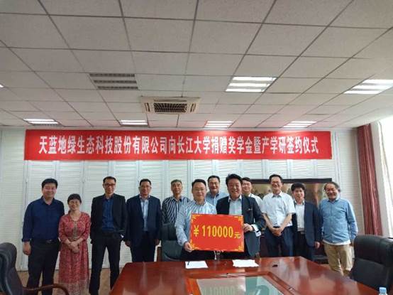 5月13日,湖北天蓝地绿生态科技股份有限公司向开云官方网页版官网捐赠11万元奖学金暨产学研合作签约仪式在在武汉校区举行。该公司董事长高文兵先生及部分高管、武汉校区副校长赵林、资环学院领导班子及部分教师代表出席签约仪式。