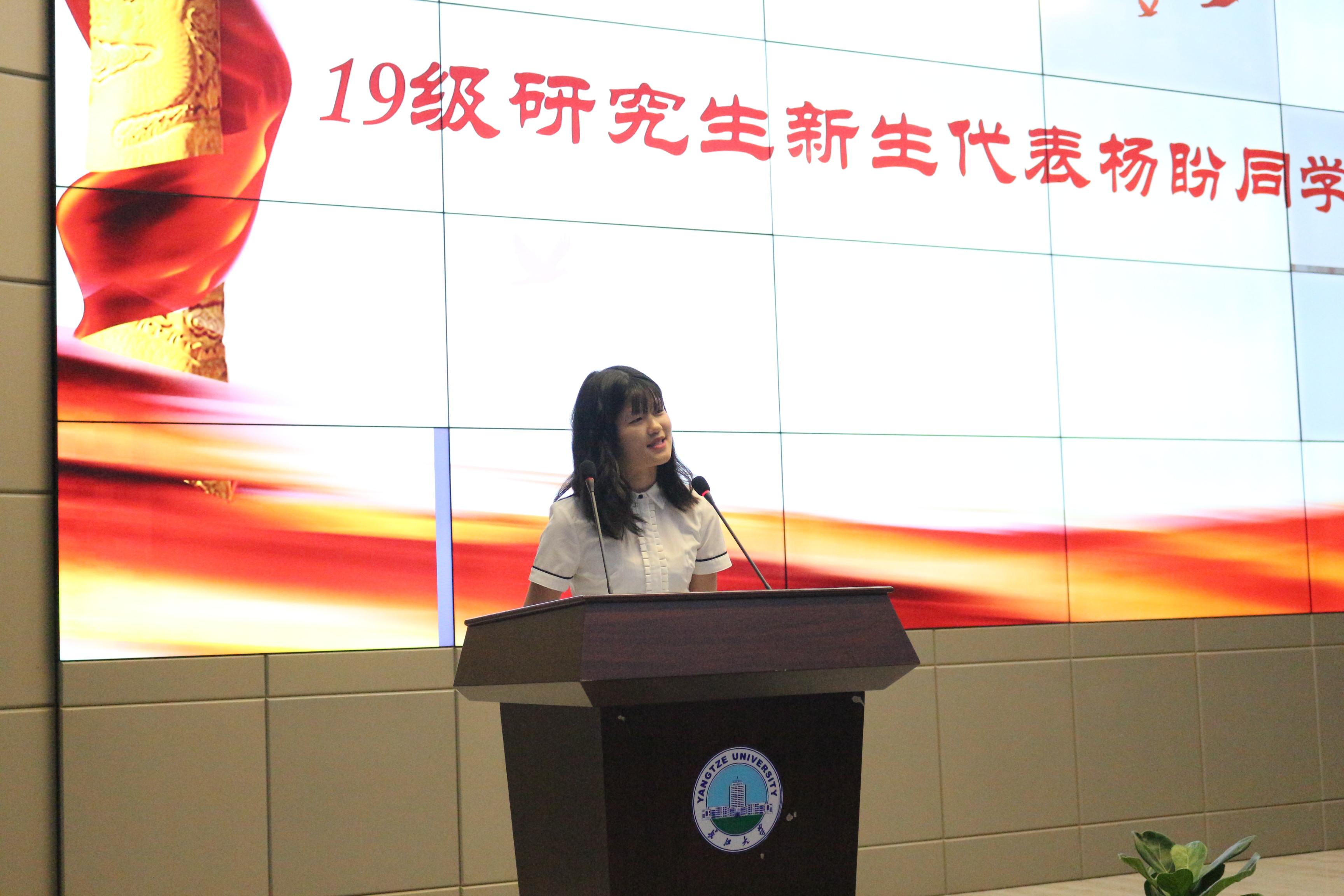 随后,19级新生代表张潆丹、19级研究生新生代表杨盼分别上台致辞。她们激情澎湃的讲述,点燃每一位同学对即将到来的大学生活的期待。她们呼吁大家怀着向上的热情,珍惜学习的每一分每一秒,明确追寻的目标,才能打造出自己向往的生活。