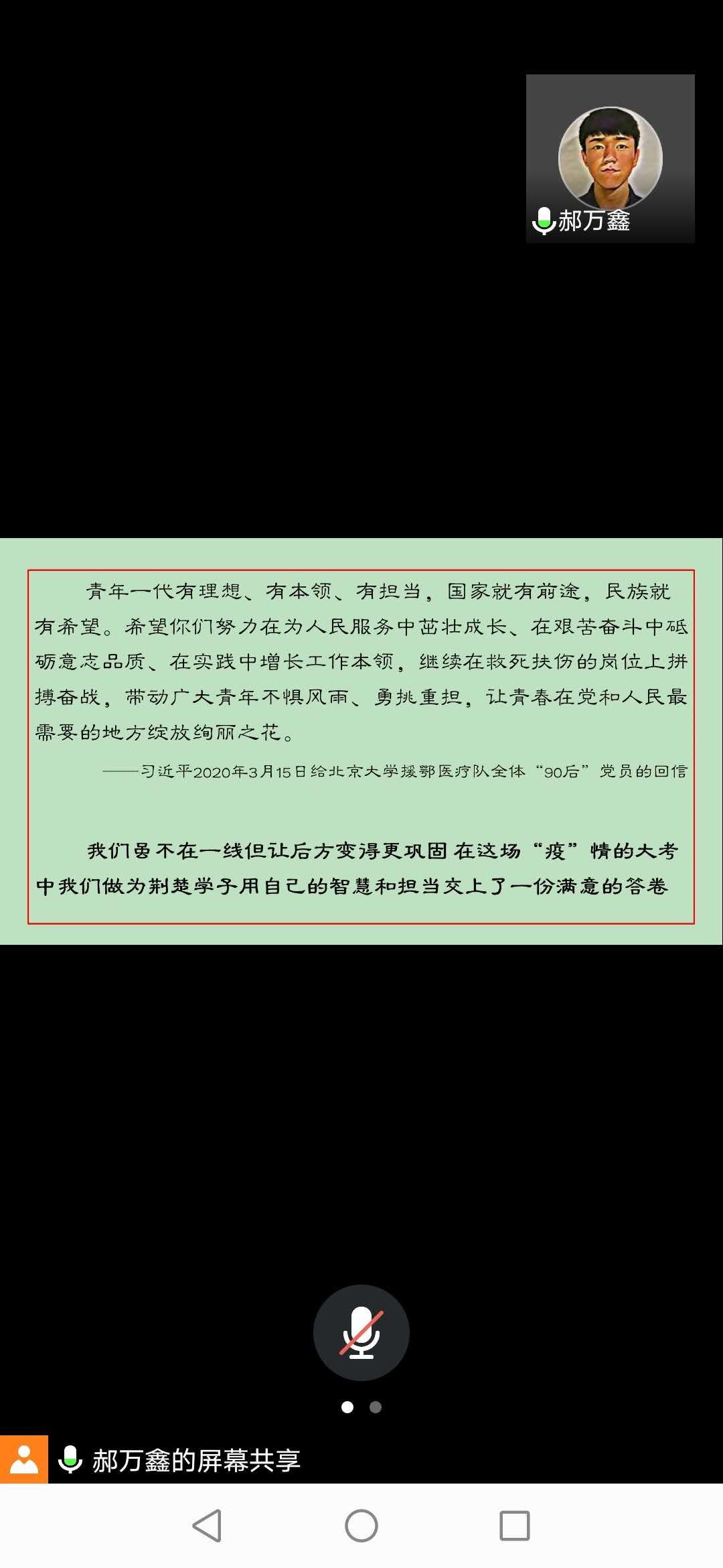 会议刚开始,本次会议的主持人也是志愿家教的牵头人郝万鑫同学在会议中介绍了志愿家教从萌芽到实施的整个过程,并向学院的三位领导详细的汇报了本次家教活动的成效。主持人说到:本次活动累计服务了来自八个省的53位中小学生,其中45名来自武汉;总共招募到来自14个省的43位志愿者,且活动取得了良好的成效。在会议中,廖靖倩、李宗珺、林欣慧三位志愿者分别分享了在本次活动中的一些收获和感悟,均表示在本次活动中人生价值得到体现。