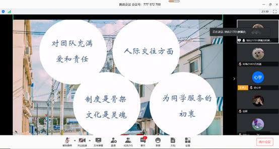 地化21701班廖佩铃同学向大家分享作为学生干部的成长经历。她向大家展示了自己的日常工作,强调作为学生干部要清楚自己的职责所在,踏踏实实地为学生服务。就如何开展班级活动、解决班级日常管理事务等问题提出了独到的见解和方法。同时,她向大家介绍了自己的学习方法和学习空间,教大家如何在保证学业的基础上真正成为学生的管理者、服务者和引领者。最后,通过分享自己疫情期间的生活,提醒各位学生干部要注重劳逸结合,不断提高综合素质。