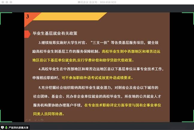 (通讯员 刘于民 图/文)在新冠疫情初步得到控制的四月,资环学院毕业生陆陆续续投入工作岗位,大三年级学生对就业细节一知半解,为使他们了解国家形式、就业政策等,资环学院严丽萍老师于4月28日通过腾讯会议开展了一次线上就业指导大会。