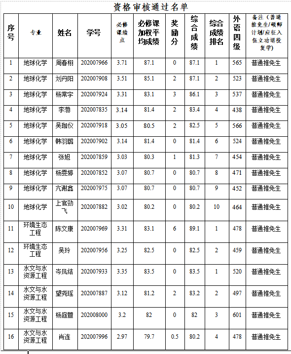 资环学院2024届报名参加推免学生资格审核通过名单公示