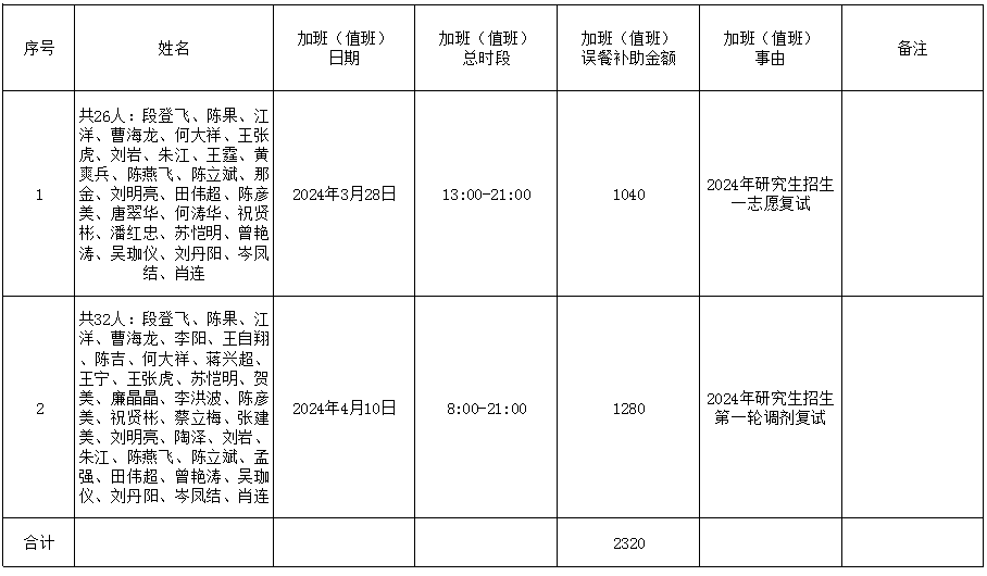 根据《开云官方网页版官网加班(值班)误餐补助管理办法(试行)》(长大校发【201983号)文件规定,现对资环学院加班(值班)误餐情况(2024328日、2024410日两天研究生招生复试)进行公示,如果对加班(值班)误餐情况有异议,可以通过电话或电子邮件等方式向资环学院办公室反映。